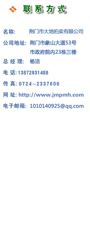 公司地:湖北省荊門市象山大道53號市政府院內23棟三樓 電話(傳真):0724-2337606 手機:13872931488